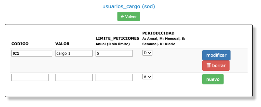 En la pantalla de gestión de cargos, hemos de indicar en LIMITE_PETICIONES la cantidad de peticiones que pueden realizar los usuarios de ese tipo y en PERIODICIDAD hemos de indicar en cuanto tiempo (día, semana, mes y año):