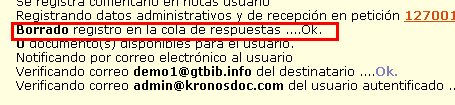 - Una situación especial es cuando ya hemos registrado la respuesta, pero nos hemos olvidado o queremos añadir otro documento. En este caso la respuesta generada comprueba si el solicitante aún no la ha registrado y añade el documento a la respuesta en cola. En caso de que el solicitante ya la hubiera registrado es cuando se genera un mensaje SHI DOC que indica que se ha recibido un nuevo documento de una petición ya registrada. Este es un caso especial en el que registrar lo que hace es recuperarlo. Por motivos técnicos no es posible eliminar la entrada de la cola automáticamente, hemos de borrarla de manera manual.